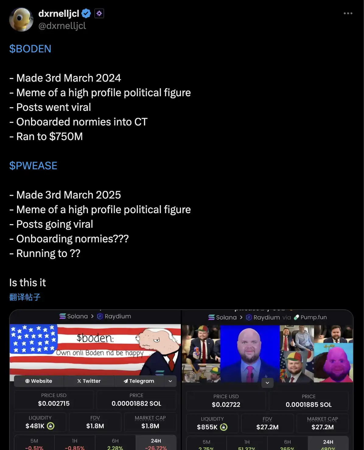 有不少人对 $PWEASE 有很高的预期,将他与去年同期发行的 $BODEN 进行类比,都同为政治人物的 Memecoin,一个是突出了前美国总统拜登的老头形象迷因化,另一个是将美国副总统万斯婴幼儿化,而 $BODEN 跑到了 7 亿 5000 万市值,认为 $PWEASE 也将会有不错的成绩。