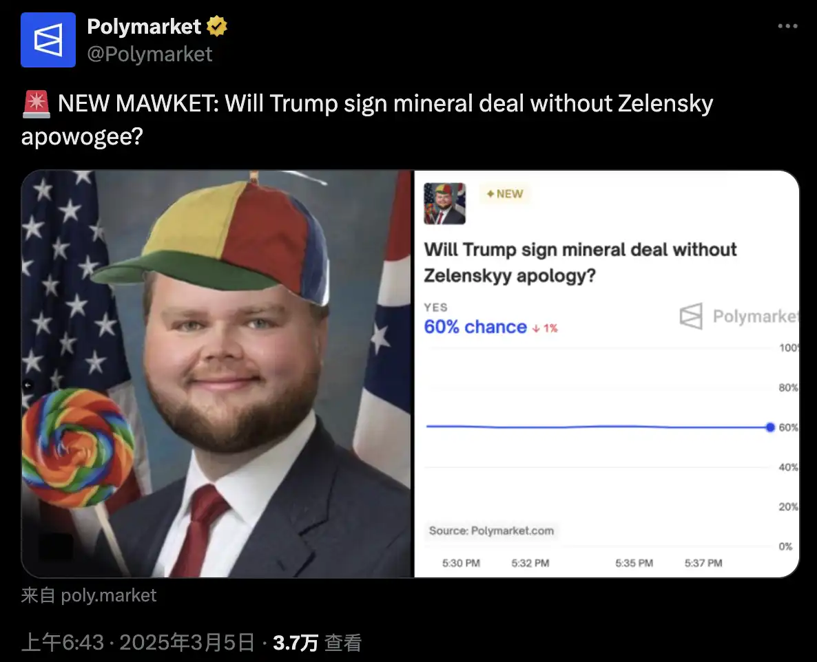 而 Polymarket 也跟上趋势,发起了多次关于特朗普、JDVance 和泽连斯基相关的投票,并用上大头 JD Vance 的 Meme,且将投票题目中的单词变种与「Pwease」相同的「Apowogee」、「vewy」等。