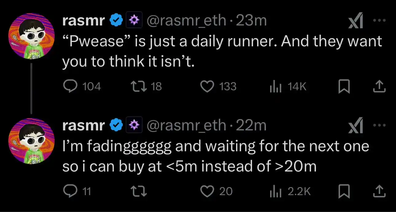 这究竟是极端行情下多日不见金狗的 Degen 集体 FOMO,还是一场代表背后理念冲突的文化运动,现在还不得而知。但是 $PWEASE 确实是将市场的关注度从名人币转回了迷因文化的本质。当然以上内容皆非投资建议,极端行情请始终珍惜自己的筹码。