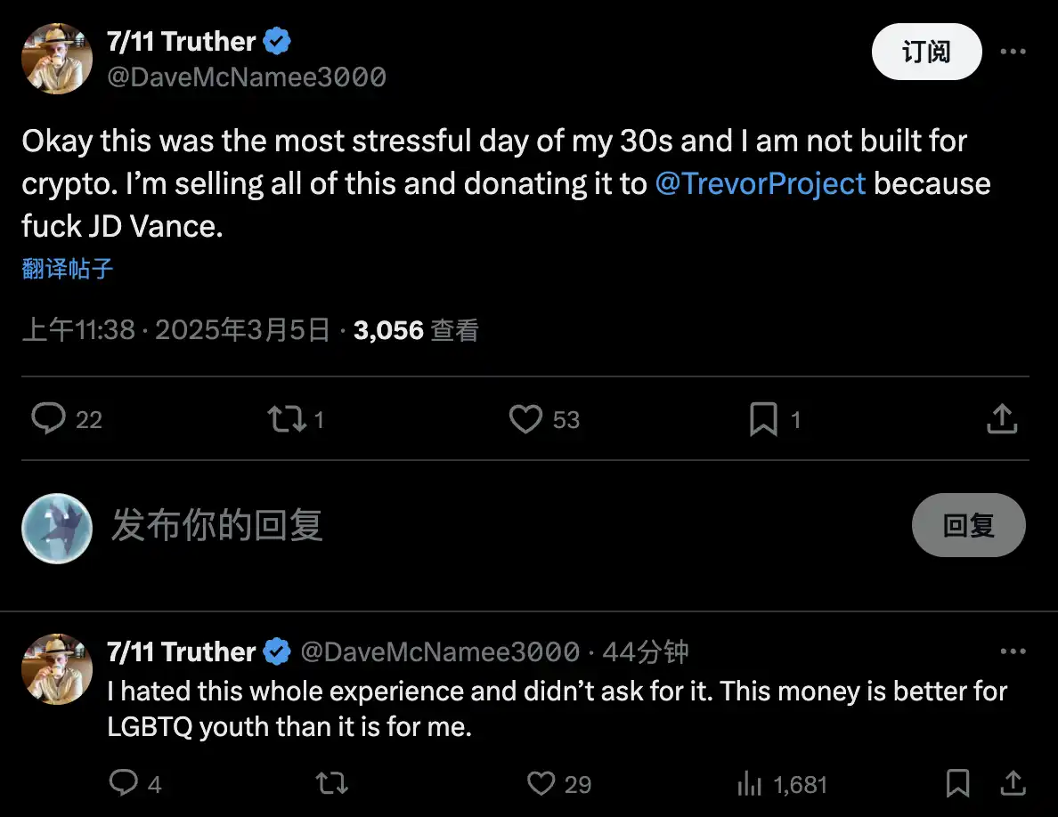 除此之外,Memecoins 的常规操作,在一个 Meme 火了之后肯定会制作其相关人物的 Memecoin。Dave 也不例外,网友将他与他的狗都制作成了 Memecoin,但都没有很好的成绩。其中最高的市值只有 48 万美元市值,而收到代币的 Dave 认为 Crypto 对他来说压力太大了,决定卖掉所有代币并将钱捐赠给 LGBTQ 组织「TrevorProject」以此来反对 JD Vanc 的政见。