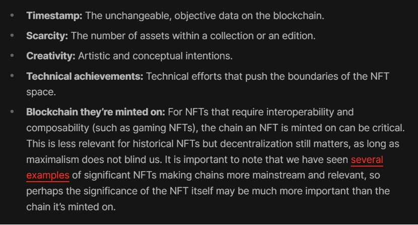 我并不是这个类别的专家。不过,数据科学家和 NFT 历史学家 Chainleft 是这个话题的权威,他最近写了一篇题为「在历史背景下定义 NFT」的有见地的文章,在文章的最后,Chainleft 强调了五个基本因素,人们在分析那些「记录历史」的 NFT 的可收集性时会重点关注的一系列元素,分别是「时间戳」、「稀缺性」、「创造性」、「技术成就本身」以及「基于哪个链铸造」。
