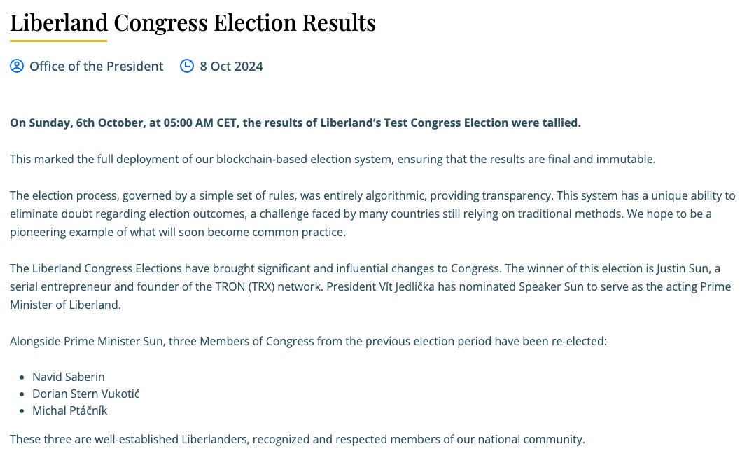 10 月 10 日,据推特(X 平台)博主 @tier10k 披露的一份文件,未获国际承认的微型国家利伯兰(Liberland)公布了其最新国会选举结果。孙宇晨在此次选举中胜出,并被利伯兰总统 Vit Jedlička 提名为代理总理。