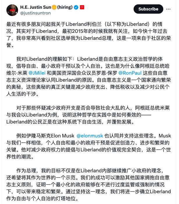 10 月 11 日,孙宇晨在社交媒体上确认其当选利伯兰(Liberland)总理一职。