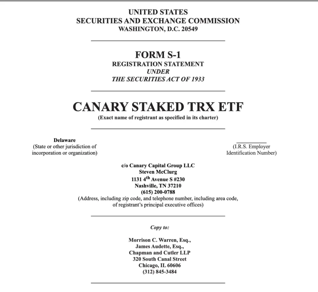 2025 年,美国证券交易委员会(SEC)正式受理 Canary Capital 提交的现货 TRX ETF 申请——这是全球首个以华人公链为底层资产的 ETF 提案。
