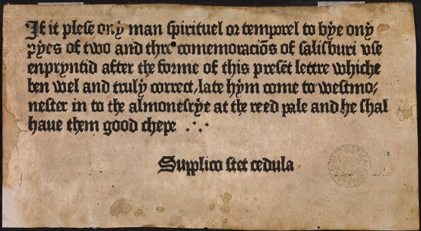 这是最早的英文印刷广告,是托马斯 - 卡克斯顿为宗教手册 Sarum Ordinal(1476 年)所印刷的广告。来自博德雷恩图书馆。