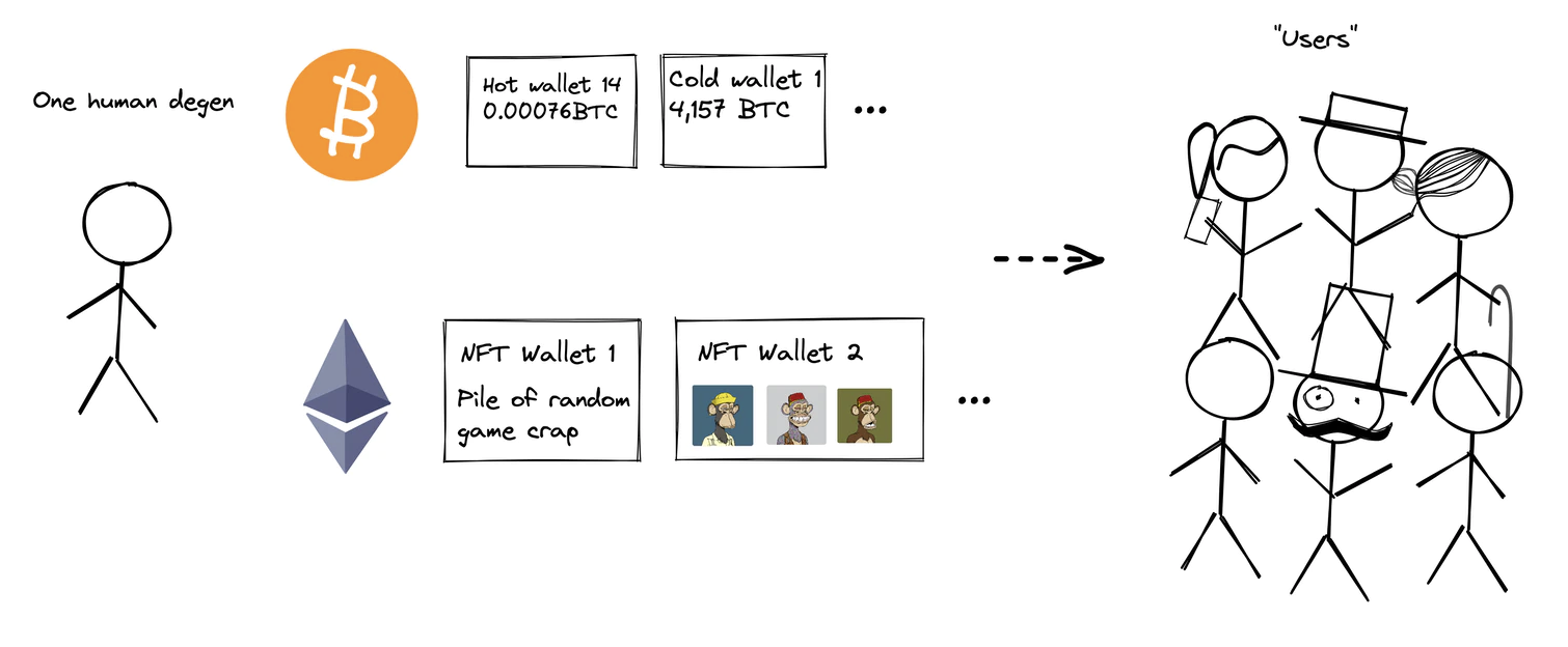 相比于 Cookies 或设备,钱包可能更糟糕:真正的加密货币 degens(源自 degenerate gambler 堕落的赌徒,暗指存在金融破产潜在可能的一个群体,即投机者)可能有几十个钱包,被遗忘的钱包、热钱包、冷钱包、不同链上的钱包等等。他们的 Web3 身份被分割成一连串的假名。虽然设备的短暂性是 Web2 中存在的问题,但钱包在 Web3 中的短暂性更普遍。