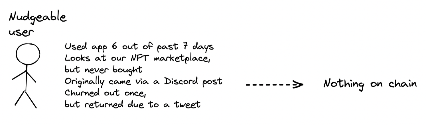让 Web2 运作的数据飞轮是双向的,在定位和归属之间反复跳跃:你抛出一些东西,试图吸引用户 —— 一部分进入了你的应用程序 —— 他们购买你的东西(或者不买)。在每个循环周期中,你都会了解到一些关于用户的信息,然后无限尝试其他内容,直到耗尽资金或想出解决方法。如今,Web2 与 Web3 之间的身份墙阻止了一切的发生,唯一的出路是跨生态系统身份,稳定地将 Web2 的身份与 Web3 连接起来。当然,这里有一个隐私方面的挑战,特别考虑到区块链数据完全缺乏 GDPR 的法律先例,但 Web2 最初也是这样发展起来的。