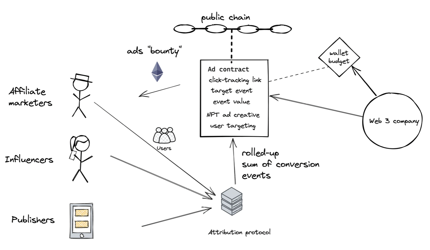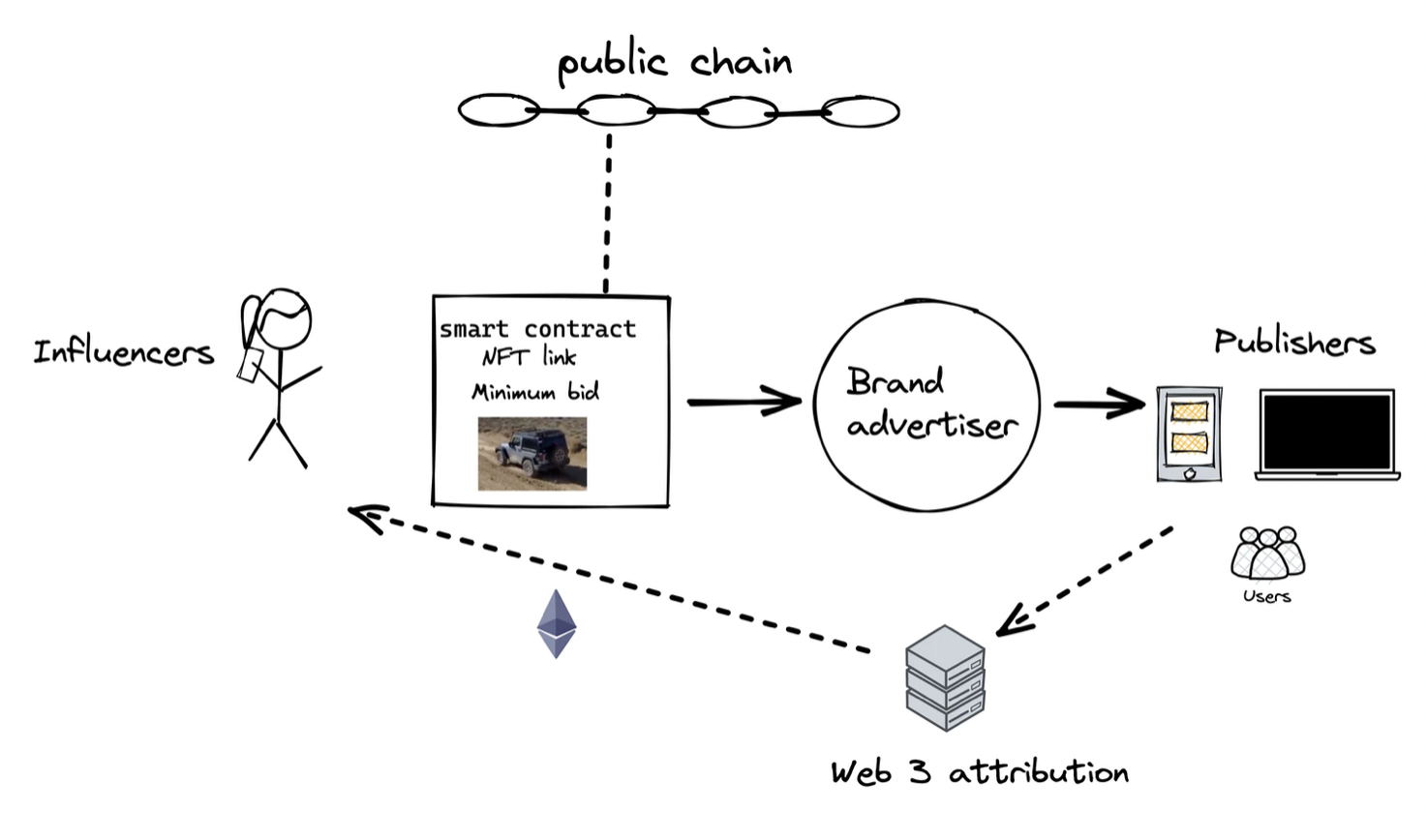 比如 Farcaster,或者其他类似的 Web3 社交媒体,想要为该产品的免费版本投放广告。他们可以利用 Web3 的可组合性和无需许可的特性来快速增加盈利,而不是像 Facebook 和其他社交媒体发布者那样建立一个完整的广告系统。假设有一个可以追踪下游事件的归因系统,可以追踪用户注册,NFT 购买,或提供流动性(Web3 的「转化」),我们可以使用以太坊区块链的去中心化计算机作为广告系统。
