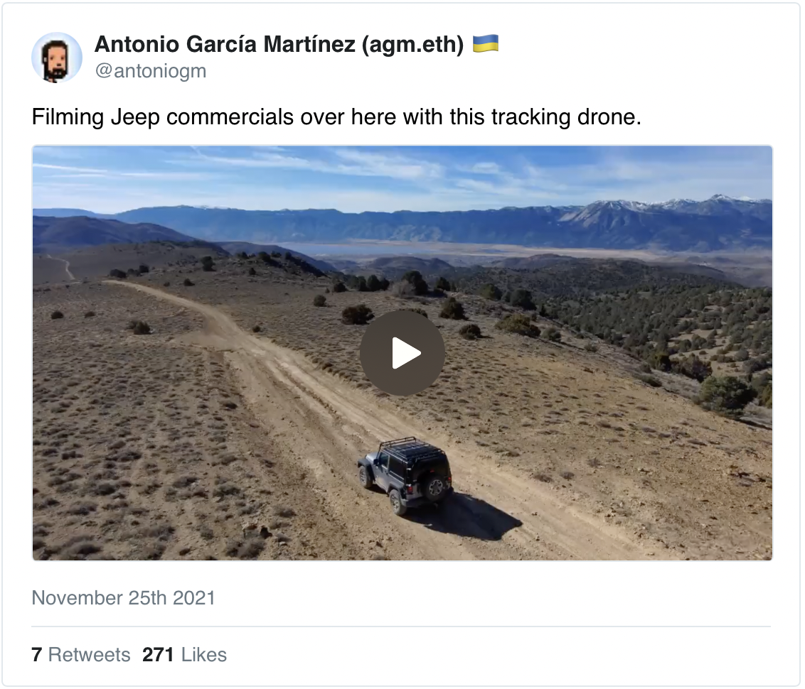 我在内华达州的维吉尼亚市高地,给我的吉普车拍摄了一段无人机追踪视频。我认为它的效果很好,如果 Jeep 公司想开展一场主题为「Where’s Your Jeep?」的营销活动来推广我的帖子,或只是在其他地方使用该视频,Web3 也可以实现这一点。