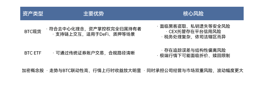 传统投资者入场时首先需要明确,自身是否认可比特币所代表的去中心化理念及其共识价值。比特币现货因具备原生属性、资产主权与链上应用能力,长期以来被视为加密资产结构中的核心组成部分,其走势也常被视为行业风向标;比特币 ETF 为习惯传统金融体系的投资者提供了便捷合规的参与方式,更适合作为进军加密市场的「试水」工具。而加密概念股由于其对比特币行情具备放大效应,具有一定「杠杆」特性,更适合用于战术性配置,抓住市场阶段性机会。