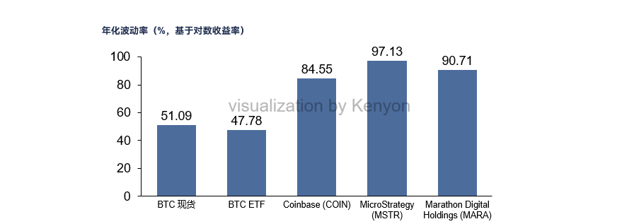 数据来源:Yahoo Finance,年化波动率基于 2025 年 1 月 1 日至 5 月 20 日的日频价格数据计算,BTC 现货按 365 日年化,ETF 与加密股票按 252 日年化处理