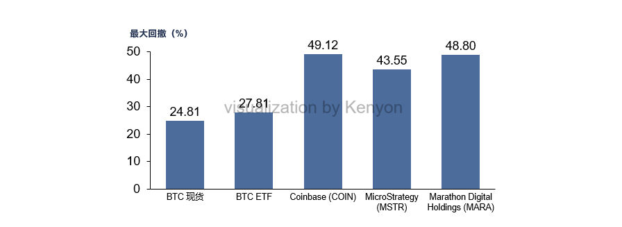 从波动率与回撤表现来看,不同类型的加密资产在风险结构上呈现出明显差异:加密概念股对价格波动的反应更为敏感,表现出较高的波动性与回撤幅度,相较下 BTC 现货与 ETF 的波动相对稳定。相关指标详见图 1 与图 2。