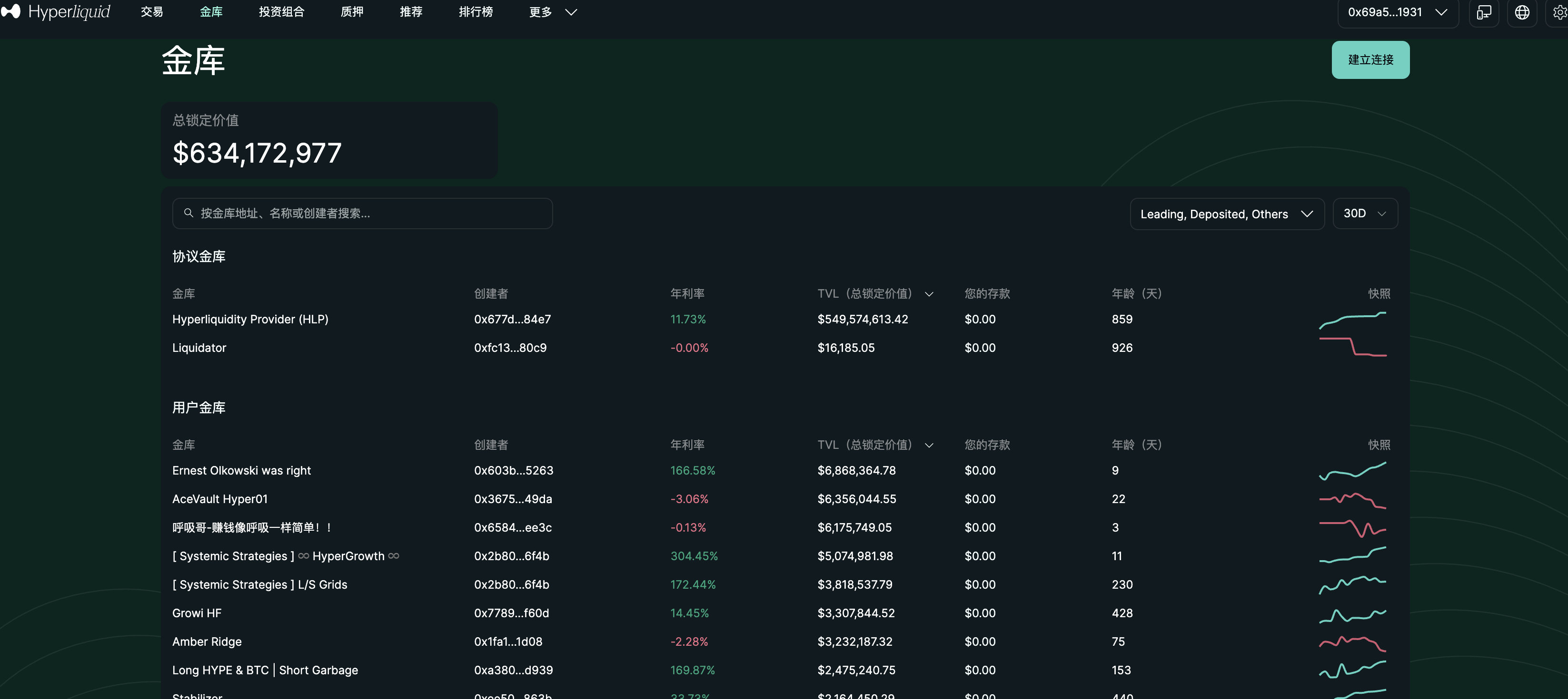 同样 Hyper 上也提供了其他用户创建的金库,你可以理解为传统金融里的混合基金。管理者会通过自己的交易系统来进行稳健的市场投资。