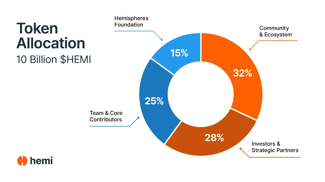 HEMI 代币总供应量为 100 亿枚,分配方案包括团队及核心贡献者 25%,Hemispheres 基金会 15%,社区及生态 32%,投资人及战略伙伴 28%。代币主要用于质押、治理、交易费用和通过 PoP 共识保障网络安全。