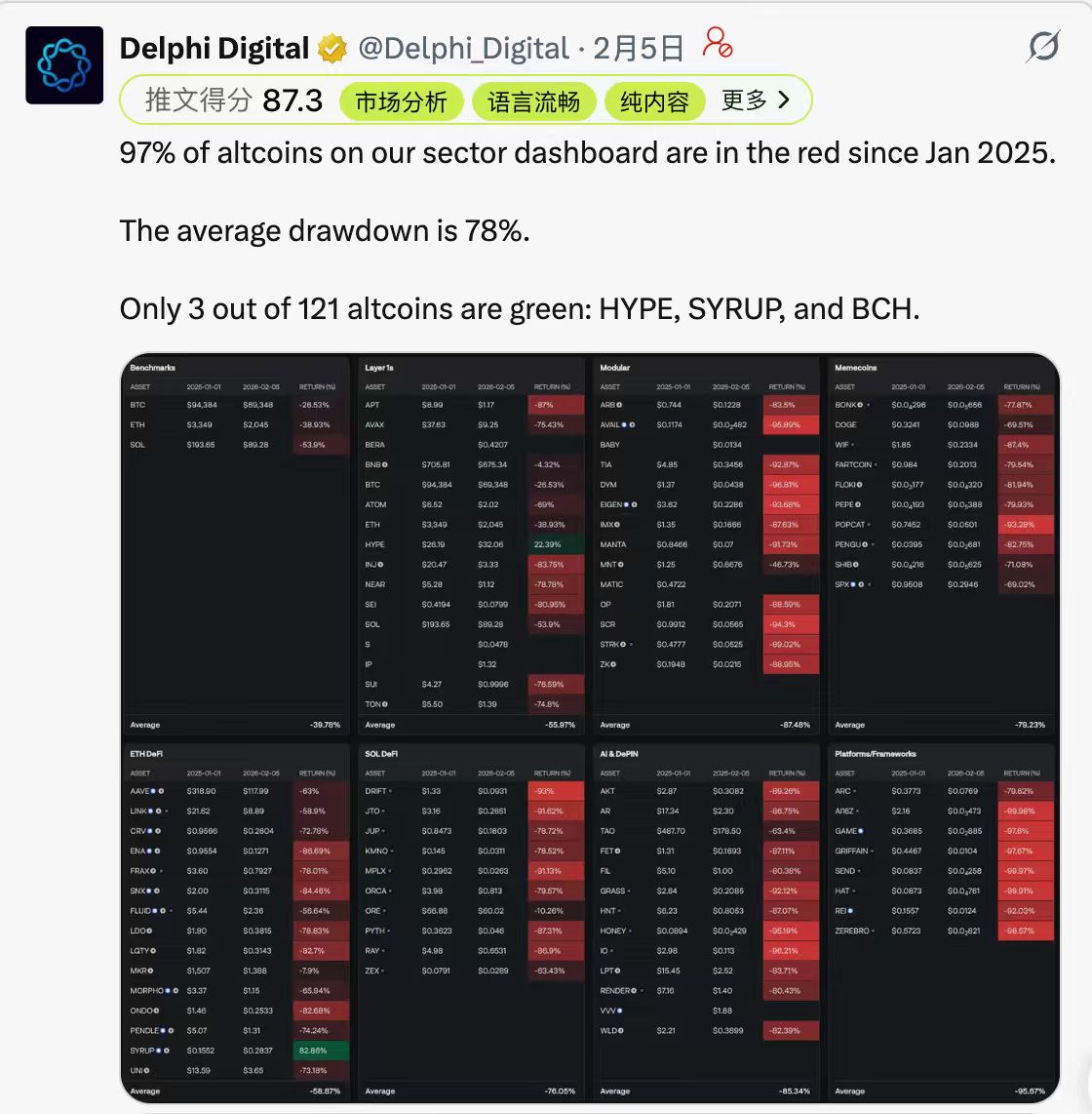 更残酷的是,这不是个例,而是在当前市场中的常态。过去一年里,市场上绝大多数新发代币都经历了明显回撤在过去一年的时间内,97% 的代币平均币价缩水 78%。当市场流动性越来越薄、退出越来越依赖二级,这套「吸血」的二级市场策略就会变得更高频、更有效、也更不可逆。