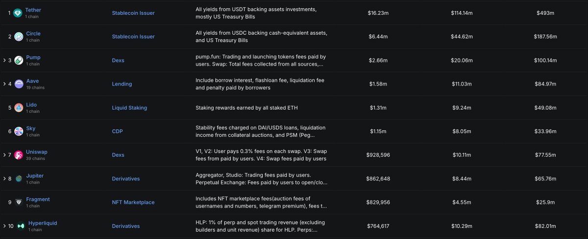 以 DeFiLlama 的统计口径为例,过去 24 小时协议收入超过 1M 美元的协议仅有 6 个,过去 30 天协议收入超过 5M 美元的也只有 49 个。这意味着仅凭协议收入,往往难以支撑过高估值,更难承接部分代币在后续解锁周期中的供给冲击。