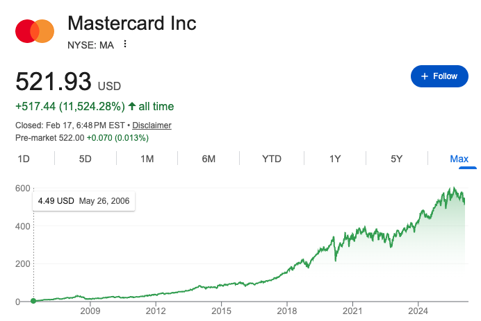 假如我们把时间线调回到 2006 年,Mastercard 在 2006 年 5 月 24 日以每股 39.00 美元完成 IPO,当时它更多被视为「银行卡网络 / 清算处理」的传统金融基础设施。