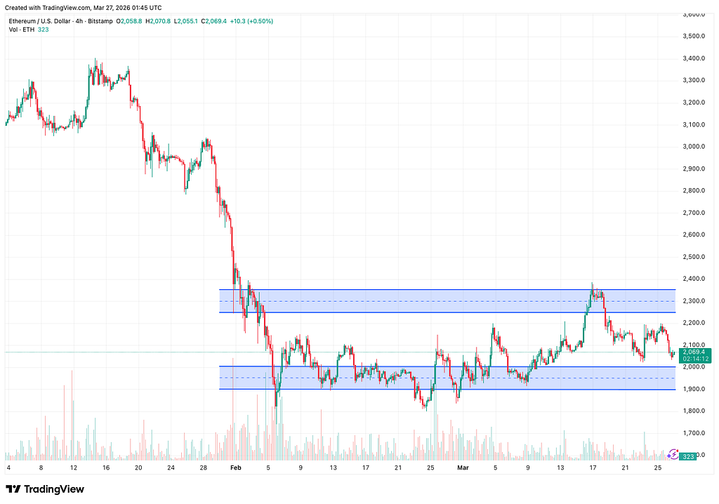 3 月,以太坊价格延续震荡偏弱格局,整体表现弱于比特币。ETH 于 2 月底约 $2,050 附近反弹后进入区间整理,主要在 $1,900–$2,200 区间运行,截至 3 月 27 日约报 $2,100–$2,200。上方关键阻力首先集中于 $2,250–$2,350 区间,该区域对应短期动态均线及前期密集成交区,多次阻止价格上行。下方 $1,900–$2,000 为重要支撑区间,一旦失守则可能进一步下探 $1,700–$1,800 的中期关键支撑。3 月 18 日 FOMC 鹰派信号后,ETH 短时承压,ETF 阶段性流入放缓,进一步压制反弹动能。能否逐步站上 $2,200 以上并放量,将是判断趋势能否由弱转强的重要观察指标,短期技术面仍偏中性偏弱。