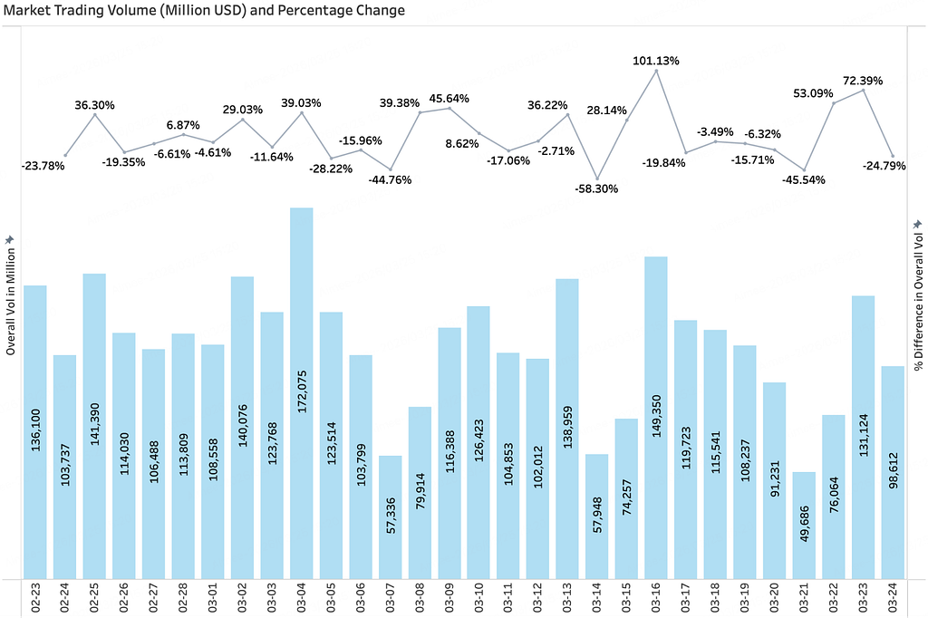 据 CoinGecko 数据,3 月整体市场交易量呈现明显的“脉冲式放量 + 快速回落”特征,波动幅度显著高于 2 月。月初至 3 月 4 日成交量快速放大至阶段高位(约 1700 亿美元量级),随后迅速回落;3 月中旬在市场情绪与事件驱动下再度放量,3 月 16 日单日涨幅高达 101%,但持续性依然不足,随后再次进入缩量区间。从节奏上看,成交放量高度集中于短期情绪催化或事件冲击窗口(如市场波动放大或链上 / 安全事件扰动),其余时间成交多处于中低水平,反映资金以短线博弈和交易驱动为主,中长期增量资金依旧缺位。下旬成交量进一步走弱并伴随多次大幅负增长(如 -45%、-24%),市场活跃度边际回落。整体而言,3 月虽较 2 月在局部时点出现更强爆发式放量,但量能缺乏连续性,市场仍未形成稳定放量趋势,结构性与事件驱动行情依然主导。