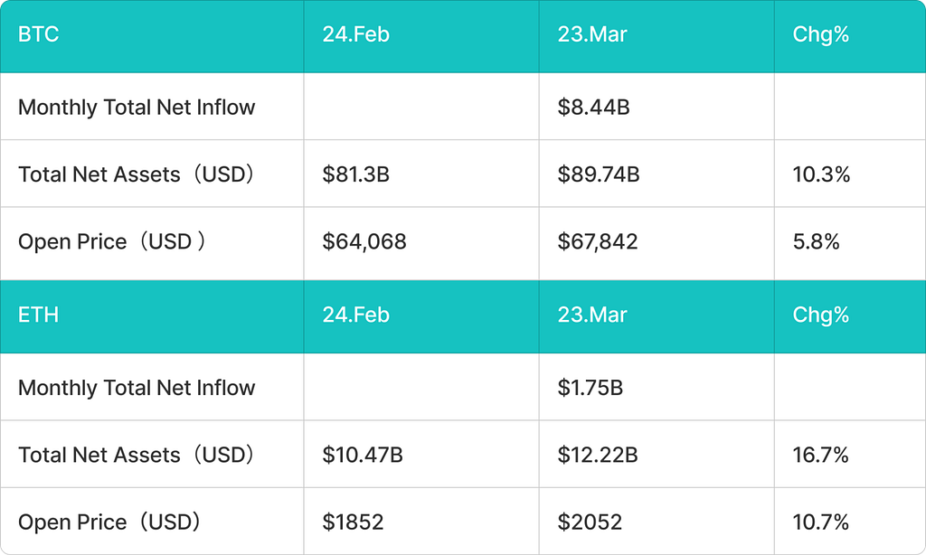 3 月 BTC 现货 ETF 资金面明显转强,呈现出由净流出向净流入的拐点。本月 BTC 现货 ETF 实现净流入约 84.4 亿美元,总净资产由 2 月 24 日的约 813 亿美元回升至 897.4 亿美元,环比增长约 10.3%。价格方面,BTC 从月初约 $64,068 上涨至 $67,842,涨幅约 5.8%。整体来看,ETF 资金重新流入与价格回升形成正反馈,表明机构资金风险偏好有所修复。相较 2 月的集中流出,3 月更像是阶段性再配置过程,一方面宏观流动性边际改善缓解了风险资产压力,另一方面 BTC 在前期大幅回调后具备估值吸引力,促使机构重新建立敞口,因此呈现出“资金回流 + 价格企稳”的修复特征。