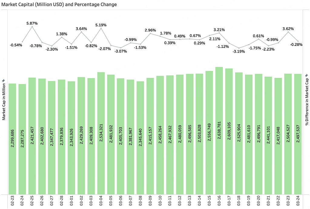 据 CoinGecko 数据,3 月加密市场总市值整体呈现“震荡上行后回落企稳”的结构。月初市值约 2.3 万亿美元附近震荡,随后逐步修复并在 3 月中旬升至阶段高点(约 2.63 万亿美元),期间日度涨幅相对温和,多数波动维持在±3% 以内,显示市场虽有修复但情绪仍偏谨慎。与 2 月相比,3 月市值运行更为平稳,未出现极端单日大幅回撤,反映系统性风险阶段性缓解。然而,中旬冲高后市值再度回落,并在 2.45 万亿–2.50 万亿美元区间反复震荡,增长动能有所减弱。整体来看,当前市场处于修复后的平台整理阶段,趋势性上行动力不足,资金风险偏好仍在修复过程中,后续走势仍需依赖宏观流动性改善、ETF 资金持续流入及政策面进一步催化。
