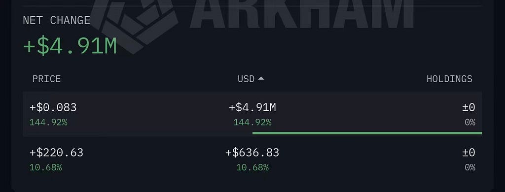 从 4 月 6 日到 4 月 13 日,$ 币安人生 迎来了狂暴反弹,价格从 $0.063 一路飙升至 $0.2199,单周涨幅高达 294%。 在这个位置,该巨鲸的账面浮盈已经暴增了超过 500 万美金。但在 Arkham 的“净头寸变化”数据栏里,赫然写着一个数字:0%。