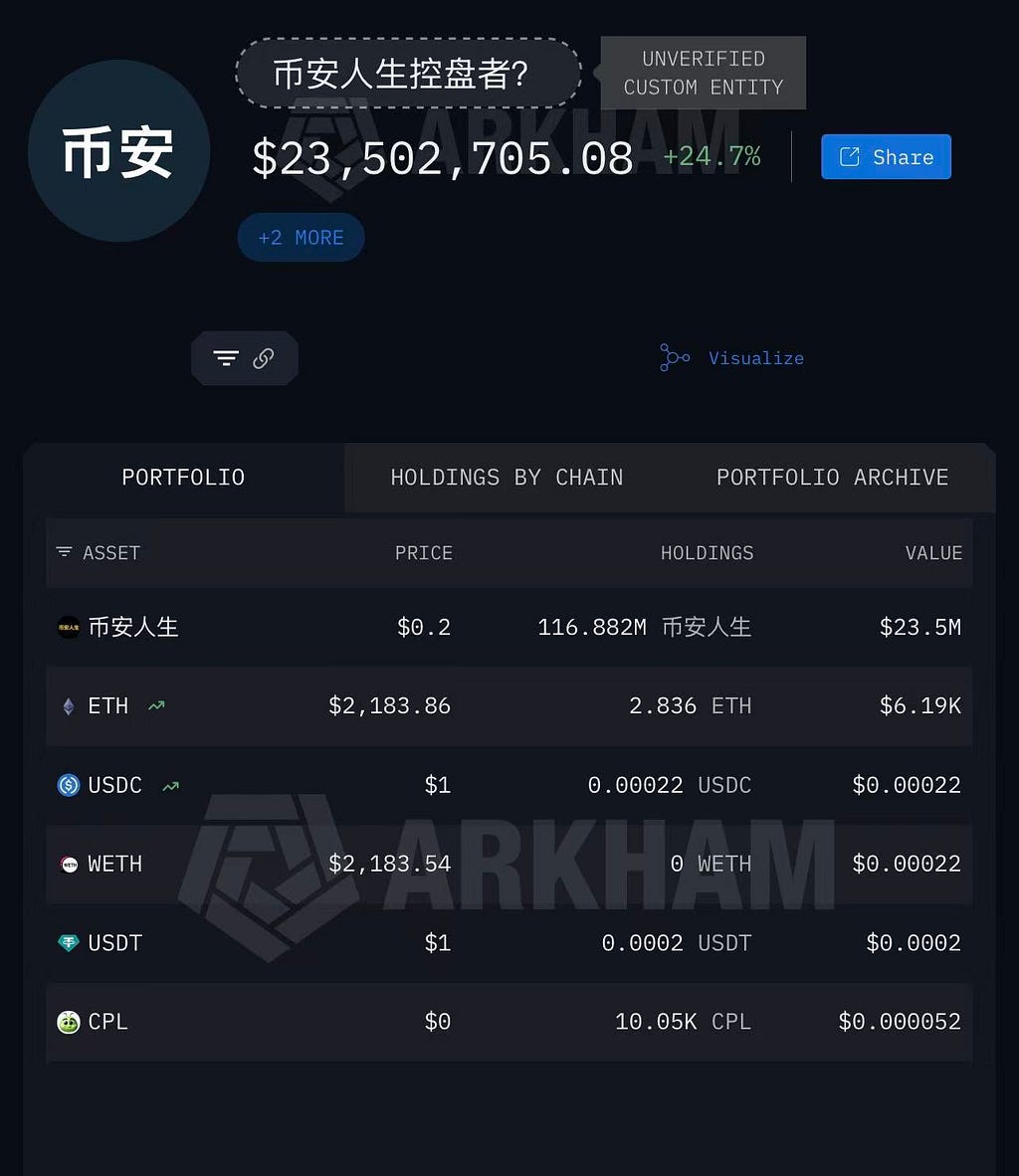 加上之前的底仓,目前这个巨鲸地址已经囤积了惊人的 1.168 亿枚 $ 币安人生,总价值高达 2350 万美金! 这不仅占据了该钱包 100% 的资产份额,更意味着市场上极其庞大的一笔流通盘被彻底锁死在了链上冷钱包中。