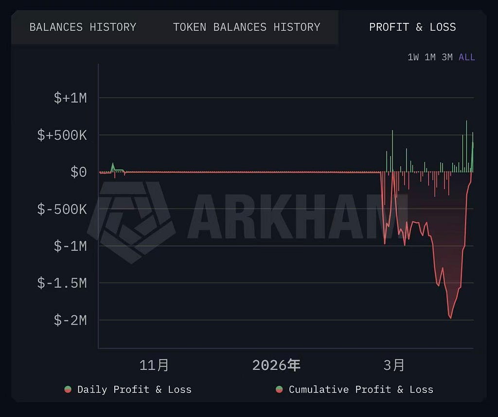 调取该实体地址的 PnL(盈亏)历史图表可以发现,这个巨鲸绝对是个“狠角色”。在今年 3 月份的市场震荡期,该地址一度承受了超过 200 万美金的巨大浮亏。但在这种足以让散户崩溃的洗盘中,主力选择了死扛,一股未割。