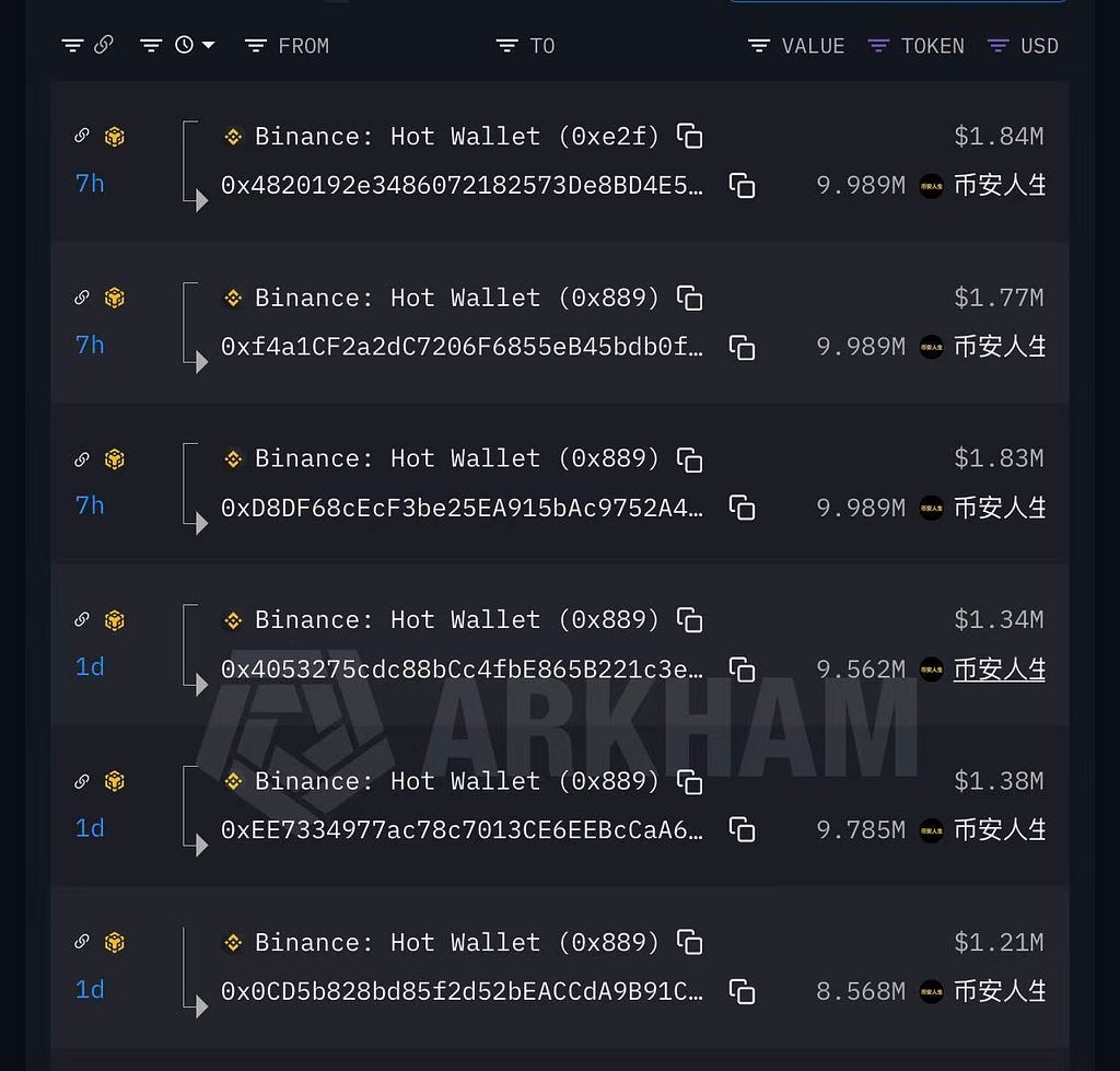 数据显示,过去十几个小时内,该实体通过多个关联钱包,分批次(每笔精准在 850 万至 998 万枚之间)从币安热钱包中疯狂提出了约 5788 万枚代币。