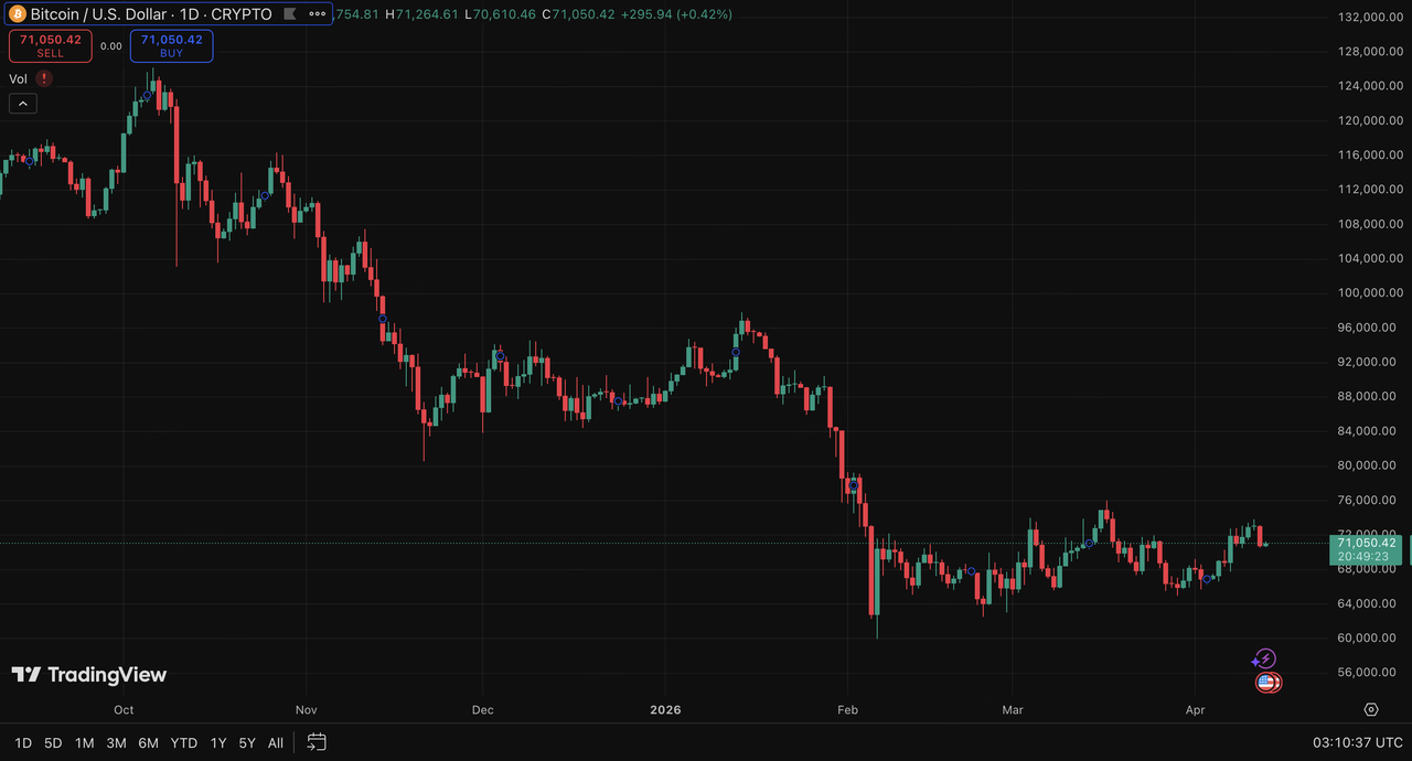 在停火预期推动下,加密市场上周一度跟随风险资产修复;但随着周末地缘风险重新升温,BTC 再度回落至 71,000 美元附近震荡。与此同时,机构风险偏好仍未明显恢复,芝商所比特币期货活跃度已降至 14 个月低点,说明传统机构在高波动环境下的配置意愿依然偏谨慎。