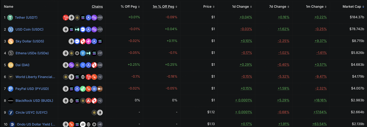 链上“现金”需求则整体维持高位。近 7 天数据显示,稳定币总发行量小幅上升,继续逼近 3200 亿美元关口。传统法币抵押和超额抵押稳定币整体表现平稳,USDT、USDC、PYUSD 均延续增长;与此同时,带有 RWA 收益属性的代币化美债产品仍在扩容,BlackRock 的 BUIDL、Ondo 的 USDY 继续走高,反映出链上美元收益工具在当前市场环境下仍具备较强承接力。