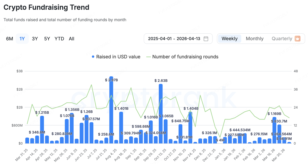 一级市场方面,CryptoRank 广义统计口径下,上周披露总额仅 6691 万美元,共 17 起资本事件,整体热度偏弱,且资金继续向少数大额项目集中。其中,RWA 基础设施项目 Pharos 完成 4400 万美元融资,占上周披露总额约 66%,成为最主要的单笔事件。