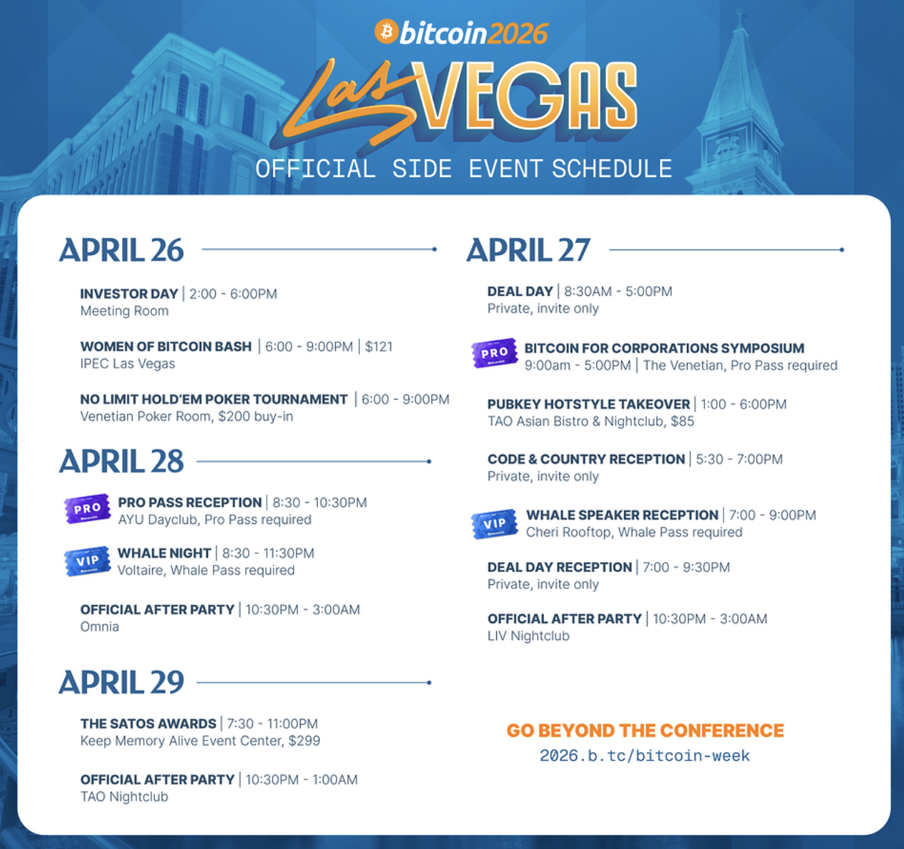 比特币峰会 2026 的影响力远不止于主会场。比特币周(Bitcoin Week)——4 月 26 日至 29 日——将拉斯维加斯打造为比特币文化、金融与社群的全城庆典。
