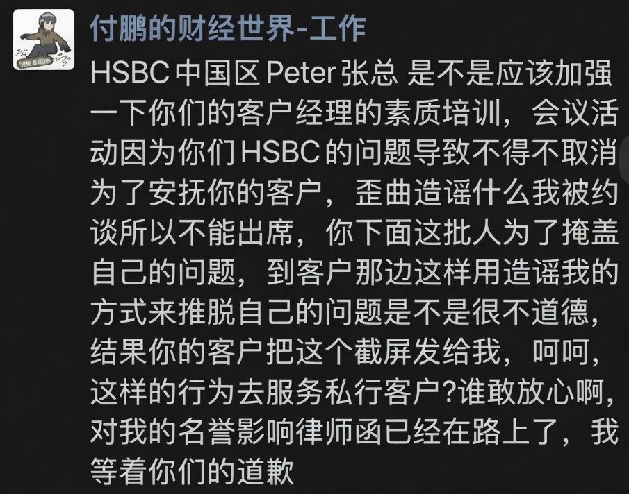 坊间出现了一个说法,称他因被监管约谈导致活动取消。付鹏公开回应,直接炮轰汇丰,晒出聊天记录,称「律师函已经在路上,等着你们的道歉」。