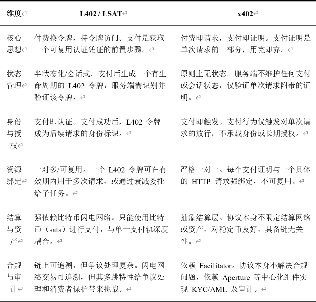 总结而言,L402 更像一个将会话式认证与链上微支付结合的方案,它通过一次支付为客户端“购买”了一段访问时间或次数。而 x402 则更纯粹地贯彻了 HTTP 无状态哲学,将每一次 API 调用都视为一次独立的、需即时清算的原子交换。