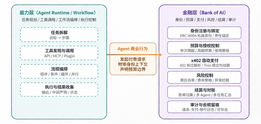 如果把 Agent 系统看成一个“干活的能力层”,负责做任务规划、调用工具和执行流程,那么 Bank of AI 扮演的就是它上面的“金融层”和“商业层”。它补上的,正是 Agent 在真正落地时常常缺少的几项关键能力,比如支付、预算控制、风险管理、结算和审计。借助这一层封装,一个原本仅具备任务执行能力的 Agent,将进一步获得预算内自主支付、风险约束、账单留痕以及责任可追溯等商业化能力。能力层负责“把事情做成”,而 Bank of AI 负责“让这些行为能够被计费、被结算、被约束、被审计”。