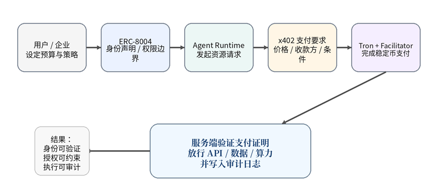 图 2 执行路径:ERC-8004 身份层 + x402 支付层 + Tron 结算层