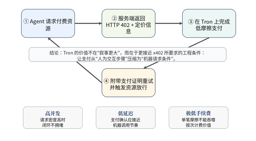 图 1 Tron 对 x402 高频支付闭环的适配逻辑