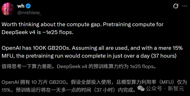 OpenAI 手里有 10 万台 GB200,哪怕只用 15% 的利用率,37 小时就能跑完同等规模的训练。
