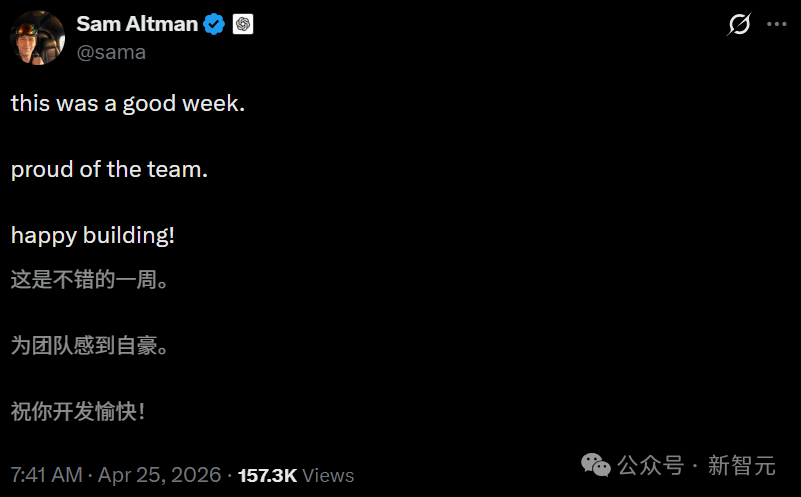 今天早上,心情大好的奥特曼发了条 X,「这周过得不错,为团队感到骄傲,祝大家开发愉快!」