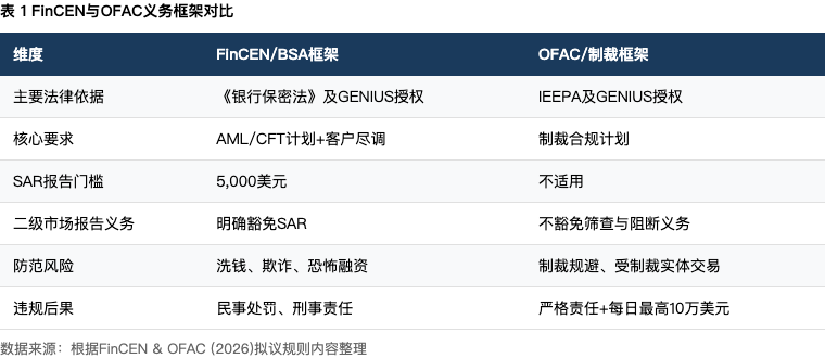 对许可支付稳定币发行人来说,该拟议规则在明确其法律地位之后,进一步为其设定了来自 FinCEN 与 OFAC 的两大并行且相互补充的合规义务体系:一是 FinCEN 主导的反洗钱与打击恐怖融资(AML/CFT)框架,二是 OFAC 主导的经济制裁合规框架;前者侧重于防范洗钱、欺诈和恐怖融资等一般性非法金融活动,后者则聚焦于阻断与受制裁实体或个人之间的交易。