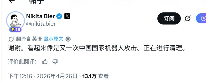 4 月 26 号,X 平台产品负责人 Nikita Bier ,把平台上泛滥的中文色情机器人和垃圾信息,直接定性为 「中国国家级机器人水军攻击」,引起了很多人中文区用户的极度不满。不少人骂他种族歧视、傲慢甩锅,说他连基本的事实都分不清。