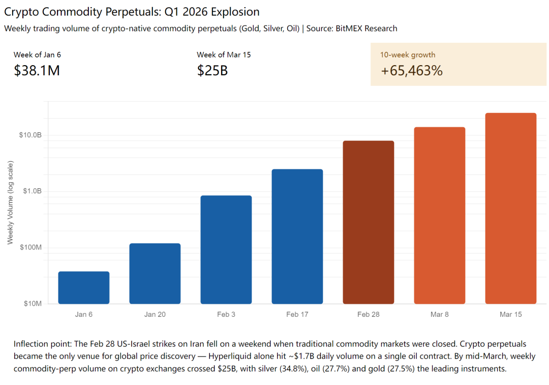2026 年 Q1,加密交易所的商品类永续合约(黄金、白银、原油)周交易量从 $38.1M 飙升至 $25B,增长 65,463%。传统资产代币化将是 Crypto 接下来 5-10 年的主线,而 Pre-IPO 代币化,只是这股浪潮中,最新加入战场的一个品类。