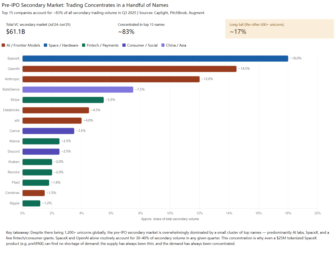 由于二级市场的交易高度集中在头部少数标的,SpaceX、OpenAI、Anthropic 等美国 AI/ 航天巨头长期占据交易量的 30-40%,加上字节、Stripe、Databricks、xAI 等头部独角兽,前 15 家就吃下了整个市场约 83% 的成交量。(这种集中度也是为什么哪怕 Bitget/Gate 这次只发 SpaceX 代币、单单一家就能轻易超募过亿,头部 Pre-IPO 的供给一直很稀缺,需求很集中。)