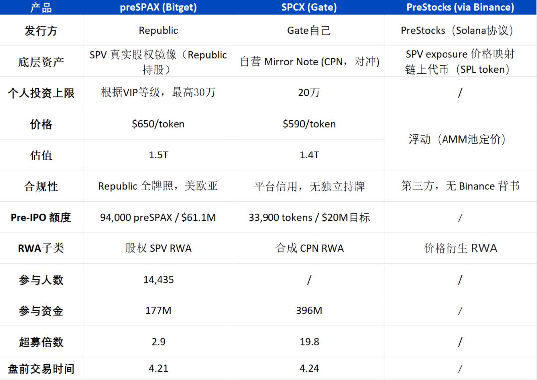 4 月,Bitget、Gate、Binance(PreStocks)三家头部交易所几乎同时上线了 SpaceX 相关的代币化产品。合规方式各有区别,但其本质都是,将过去仅面对超高净值客户的 pre-IPO 市场份额,拆成碎片卖给散户。