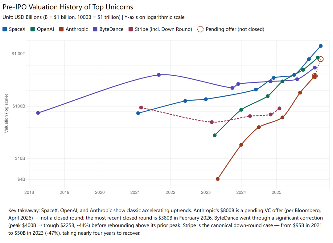 头部优质标的的融资估值通常单调上行。SpaceX 从 2021 年的 $74B 涨到现在的 $1.4T+,OpenAI 从 $29B 涨到 $852B+,Anthropic 从 $4B 涨到 $800B+,字节从 $75B 涨到 $600B+。每一轮新融资都在抬高估值,老股东随之水涨船高。
