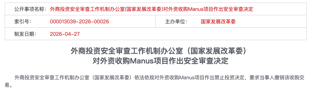 2026 年 4 月 27 日,外商投资安全审查工作机制办公室(国家发展改革委)依法依规对外资收购 Manus 项目作出禁止投资决定,要求当事人撤销该收购交易。