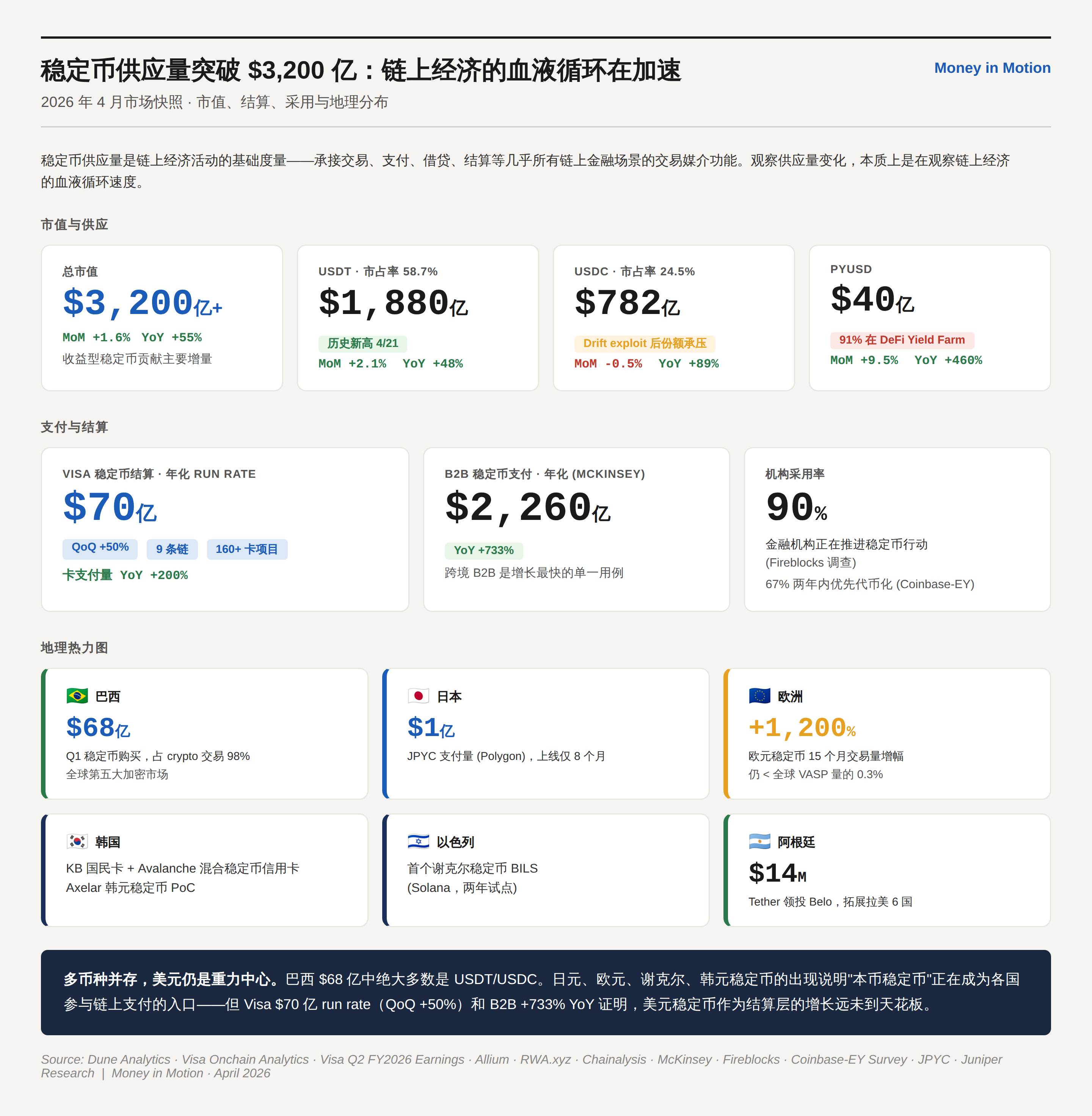 巴西 Q1 稳定币购买 $68 亿,占全部 crypto 交易 98%。Lula 在大选前暂停稳定币税。日本 JPYC 在 Polygon 上支付量突破 $1 亿(上线仅 8 个月)。韩国 KB 国民卡在 Avalanche 上测试混合稳定币信用卡,Axelar 完成韩元稳定币 PoC。