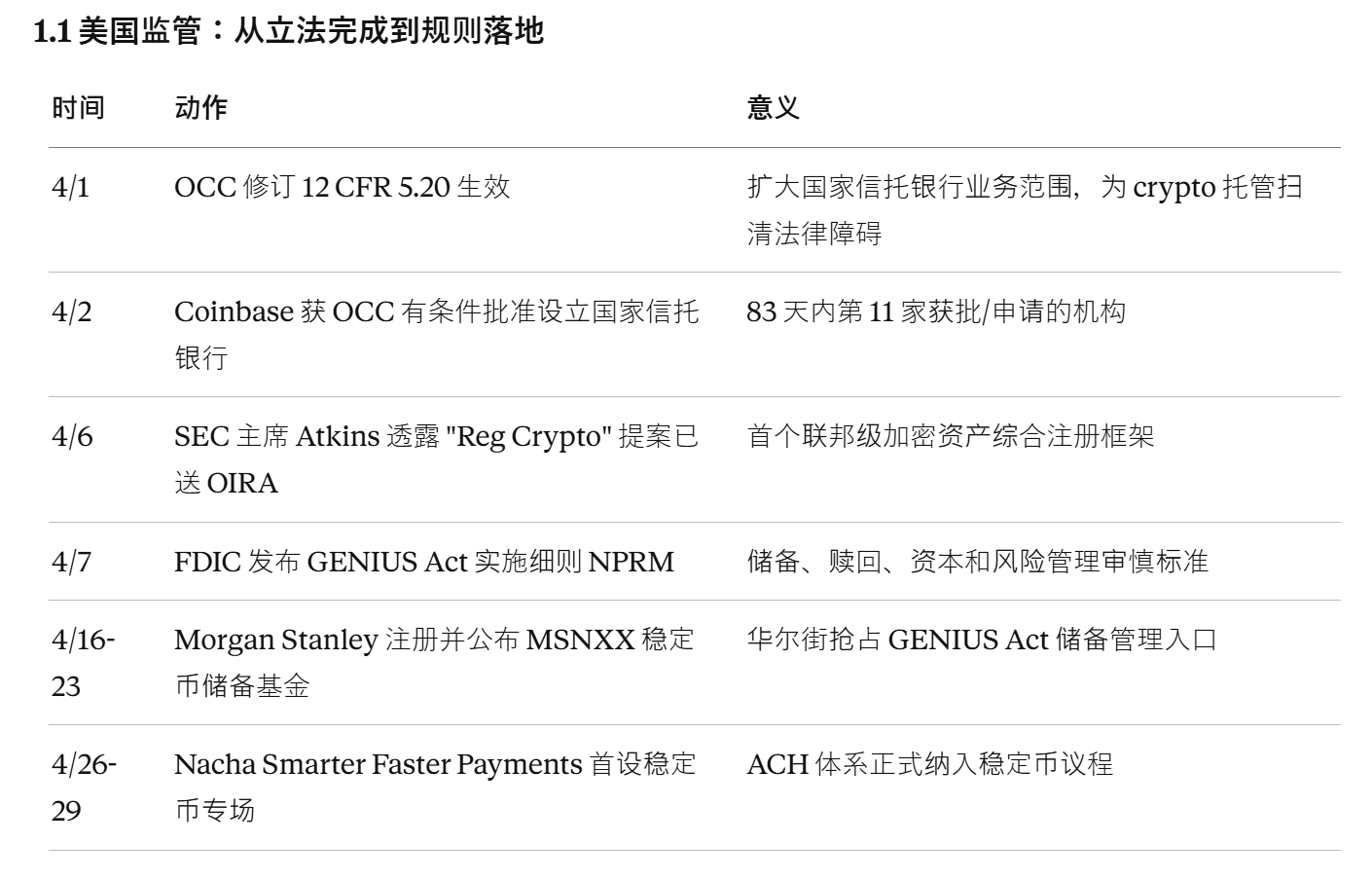 4 月的美国监管拼图由三条线组成:GENIUS Act 管发行,SEC Reg Crypto 管资产分类,OCC 信托银行管托管和结算。