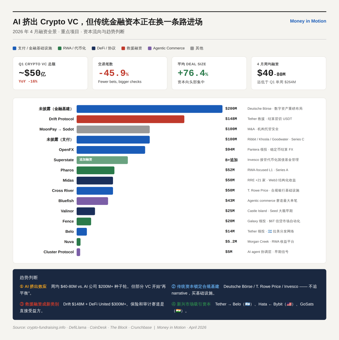 Q1 crypto VC ~$50 亿(YoY -16%),交易笔数 -45.9%,deal size +76.4%。4 月周均 $40-80M。AI 挤出效应显著。